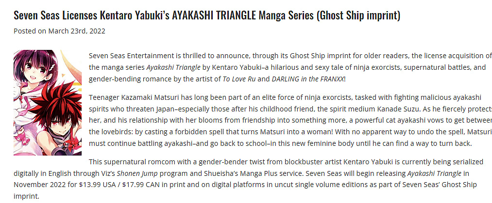 On March 23, 2022, Seven Seas announced that it will be licensing Ayakashi Triangle and releasing the series uncensored in single volume editions as part of their Ghost Ship imprint