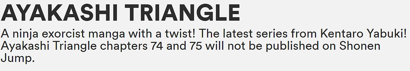 Since then, there has nothing but complete silence from either outlet outside of a vague confirmation statement by Viz on the series’ English language webpage informing readers simply that “Ayakashi Triangle chapters 74 and 75 will not be published on Shonen Jump.”