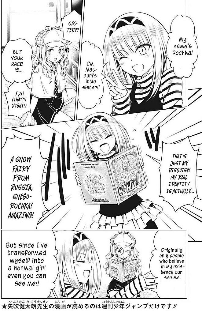 Amidst her investigation, she discovers that a multiple-centuries-old Russian snow fairy ayakashi named Rochka has been living with Matsuri and pretending to be his little sister.