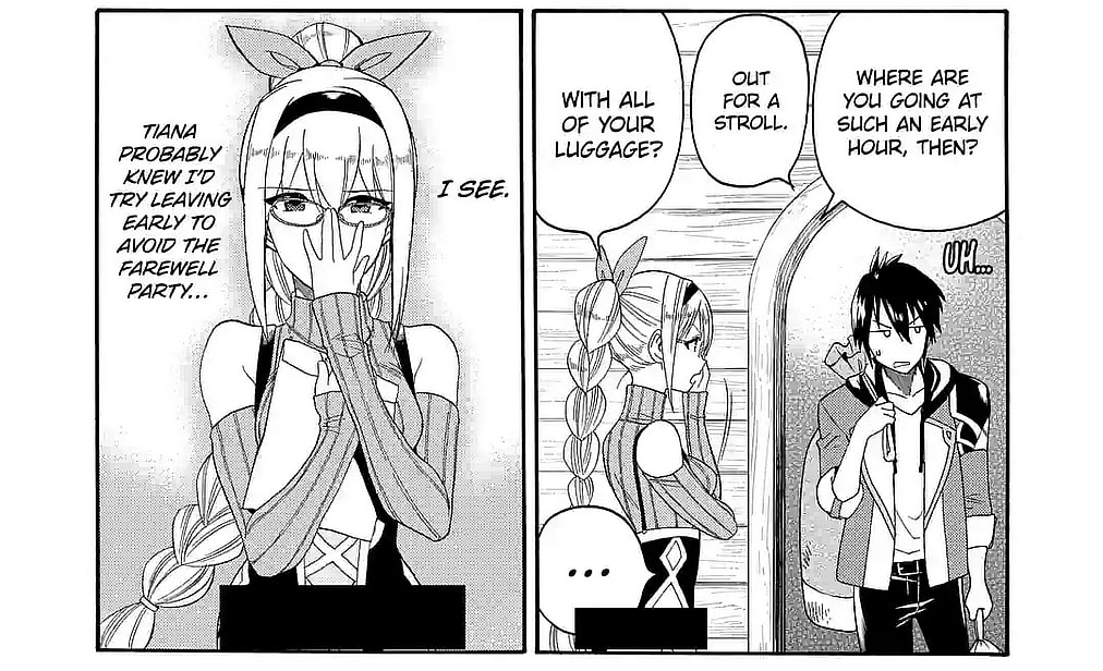 In the world of isekai, Square Enix covered up the bottom portion of Tiana’s standard leotard outfit in Ouji Kuro’s manga adaptation of Yoshiyuki Takahashi’s and teffish’s From Leveling Up the Hero to Leveling Up a Nation: