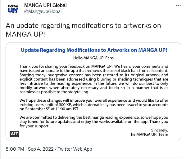 In response to this outrage, Square Enix took to the official Manga UP! Global Twitter account on September 4th to announce that “starting today, suggestive content has been restored to its original artwork and explicit content has been addressed using blurring or shading techniques that are less intrusive to the reading experience.”