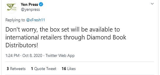 When asked on Twitter whether it will only be available in the United States and Canada, Yen Press confirmed it will be available internationally for retailers to purchase through Diamond Book Distributors.