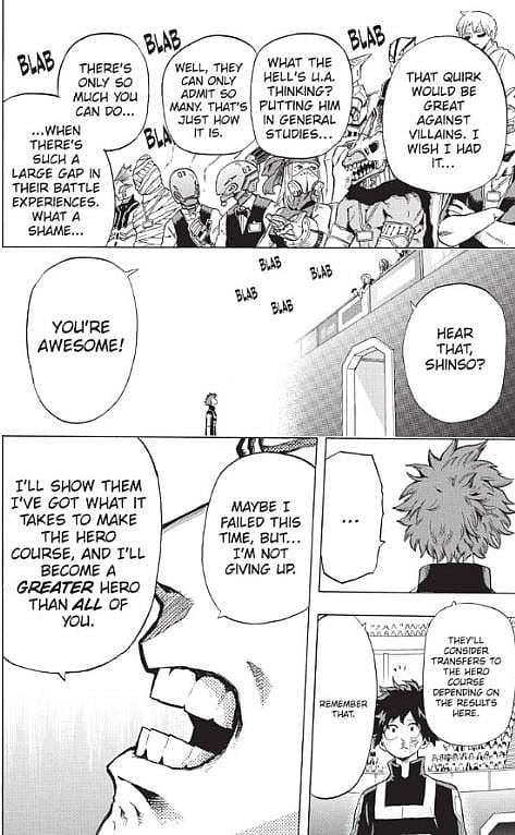 He exclaims, “Maybe I failed this time, but…I’m not giving up. I’ll show them I’ve got what it takes to make the Hero Course, and I’ll become a greater hero than all of you.”