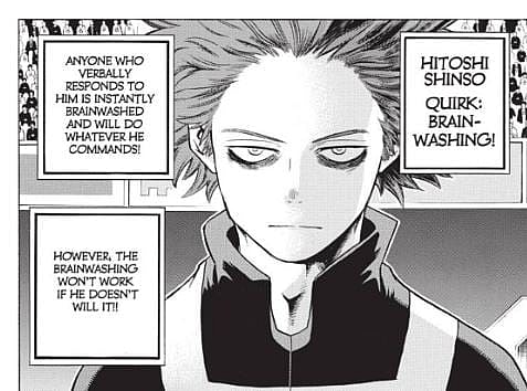 It’s then revealed that Shinso’s quirk is called Brainwashing, and it allows him to instantly brainwash anyone who verbally responds to him. The brainwashing allows him to command anyone under his influence to do as he says.