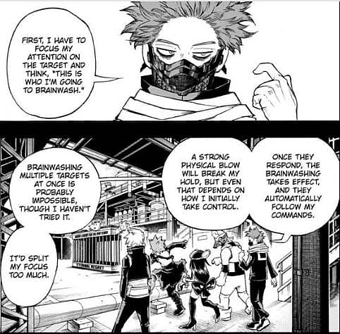 “First, I have to focus my attention on the target and think, ‘this is who I’m going to brainwash,'” explains Shinso. “Once they respond, the brainwashing takes effect, and they automatically follow my commands. A strong physical blow will break my hold, but even that depends on how I initially take control. Brainwashing multiple targets at once is probably impossible, though I haven’t tried it. It’d split my focus too much.”