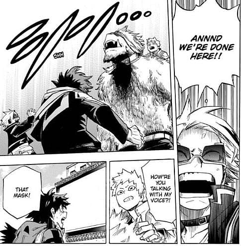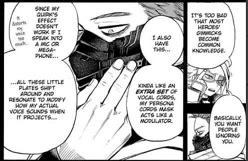 He elaborated, “Since my quirk’s effect doesn’t work if I speak into a mic or megaphone… all these little plates shift around and resonate to modify how my actual voice sounds when it projects…”