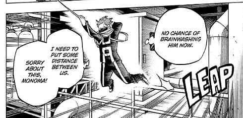 With Deku unleashing his new Blackwhip ability, Shinsu attempts to flee, seeing no opportunity that would allow him to brainwash his foe.