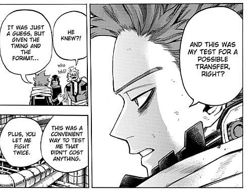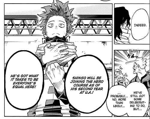 Following his defeat at the hands of Deku and Class 1-A, Shinso would reveal his suspicions that his inclusion in the training exercise was a test on whether or not he would be able to transfer into the Hero Course.