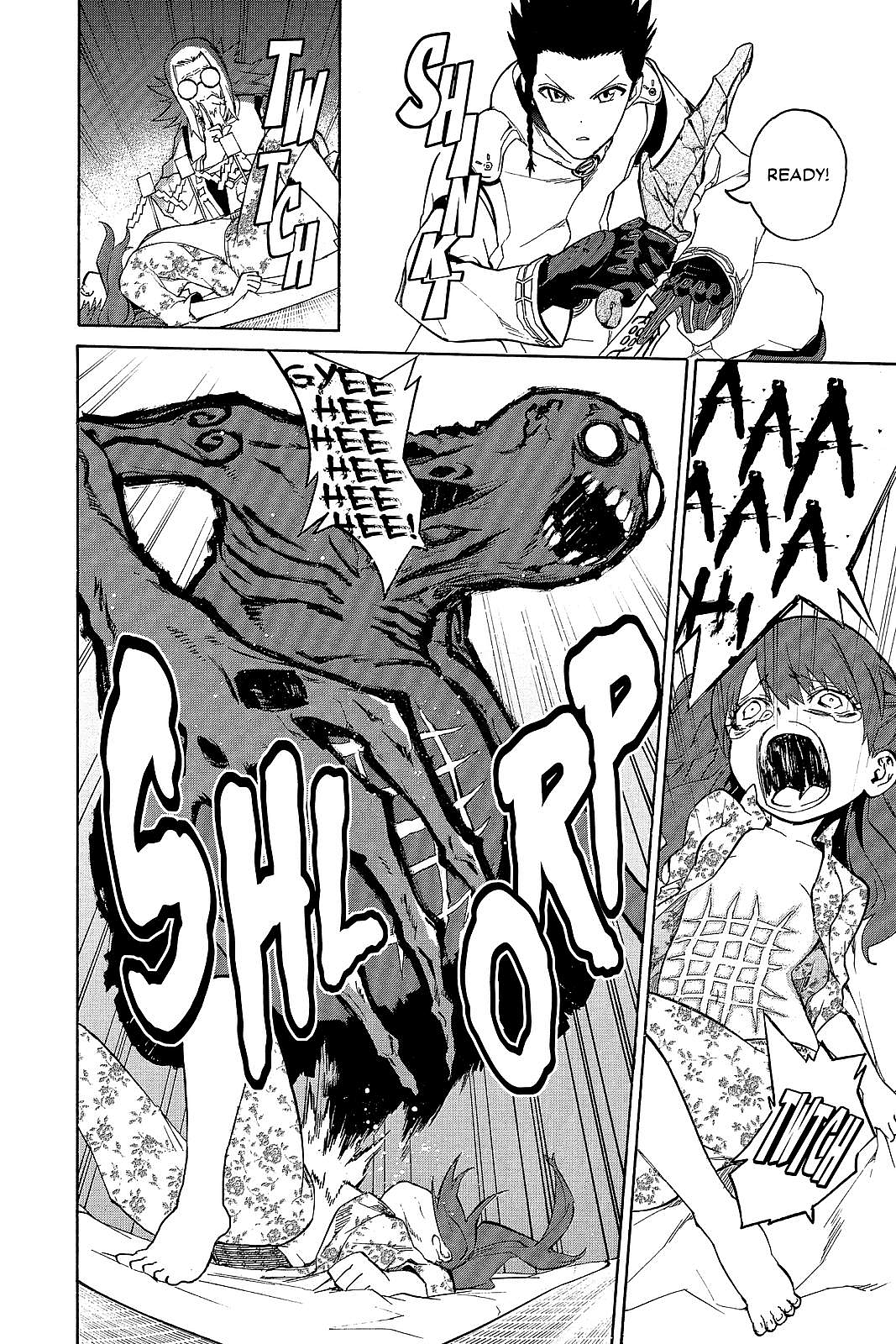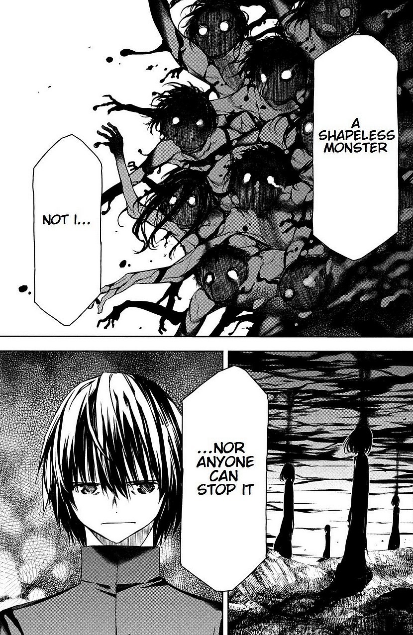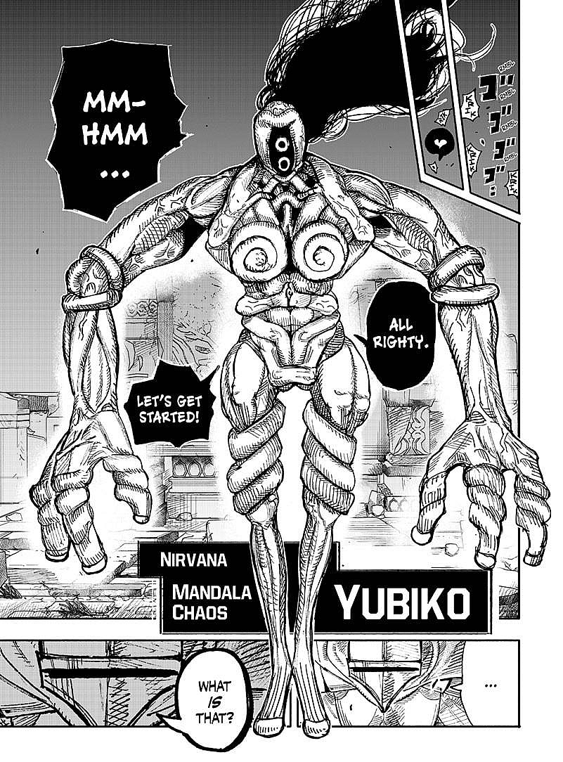 Fully manifesting itself during her fight with Azuma at the Ojima Tower Ruins (Ch. 29), the psychotic and sadistic Yubiko’s creepy choujin form has the ability to duplicate and extend her body parts at an accelerated rate.