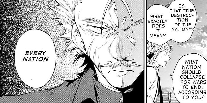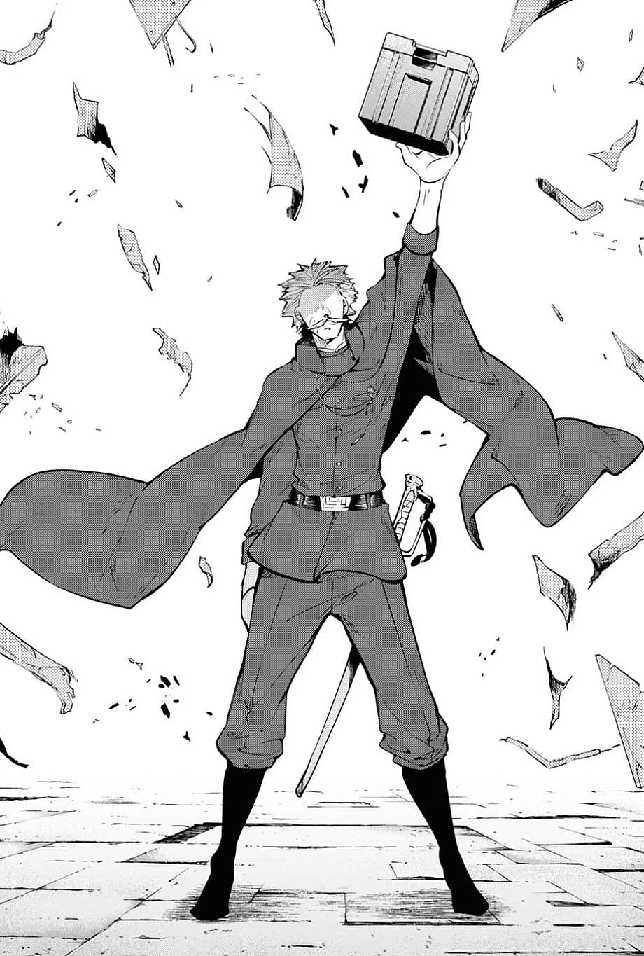 A world renowned war hero, Fukuchi leads a number of notable groups, including the Hunting Dogs, the terrorist organization The Decay of Angels, and the the United Nations anti-terrorism taskforce known as the Humankind Army.