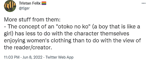 Balistrieri further noted that said friend also shared with them “The concept of an ‘otoko no ko’ (a boy that is like a girl)”, with they explain “has less to do with the character themselves enjoying women’s clothing than to do with the view of the reader/creator.”