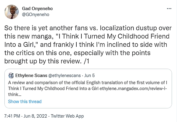 Retweeting Ethylene Scans’ sharing of their initial comparison report, Onyeneho posited, “So there is yet another fans vs. localization dustup over this new manga, ‘I Think I Turned My Childhood Friend Into a Girl,’ and frankly I think I’m inclined to side with the critics on this one, especially with the points brought up by this review. /1”