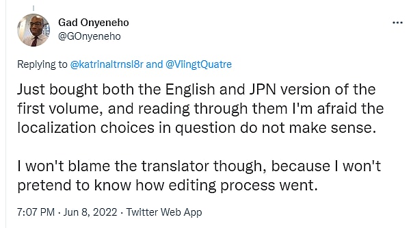 However, Onyeneho quickly shut down this disingeunous appraisail of Ethylene Scans’ work, informing Leonoudakis, “Just bought both the English and JPN version of the first volume, and reading through them I’m afraid the localization choices in question do not make sense. I won’t blame the translator though, because I won’t pretend to know how editing process went.”