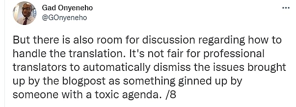 “But there is also room for discussion regarding how to handle the translation,” Onyeneho stated. “It’s not fair for professional translators to automatically dismiss the issues brought up by the blogpost as something ginned up by someone with a toxic agenda.”