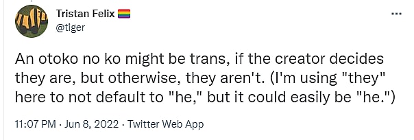 “I talked to a Japanese friend about it,” he recalled. “They said, ‘This is not a trans story. It’s a manga for getting butterflies (moe-kyun suru) about otoko no ko BL.'”
