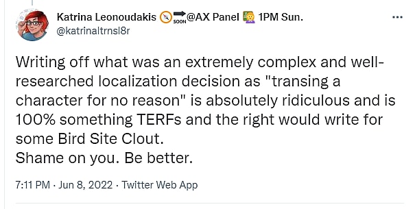 “Writing off what was an extremely complex and well-researched localization decision as ‘transing a character for no reason’ is absolutely ridiculous and is 100% something TERFs and the right would write for some Bird Site Clout,” she worte, before proceeding to do her best MCU Sam Wilson impression. “Shame on you. Be better.”