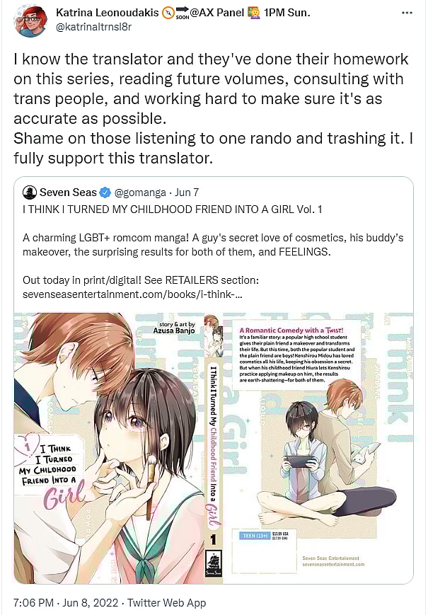Taking to Twitter, Leonoudakis declared, “I know the translator and they’ve done their homework on this series, reading future volumes, consulting with trans people, and working hard to make sure it’s as accurate as possible.”