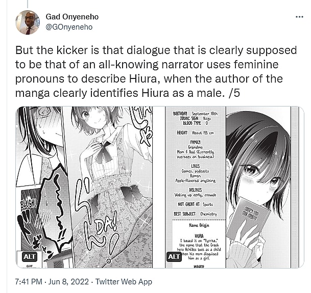 He continued, “But the kicker is that dialogue that is clearly supposed to be that of an all-knowing narrator uses feminine pronouns to describe Hiura, when the author of the manga clearly identifies Hiura as a male,”