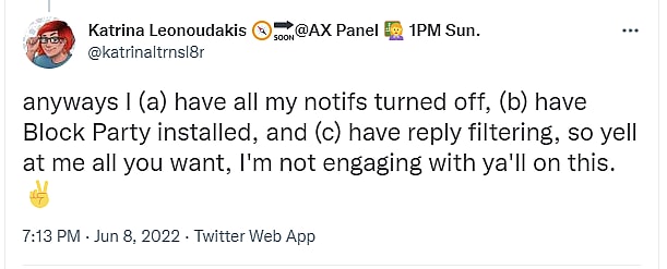 “anyways I (a) have all my notifs turned off, (b) have Block Party installed, and (c) have reply filtering, so yell at me all you want, I’m not engaging with ya’ll on this,” she concluded her thread.