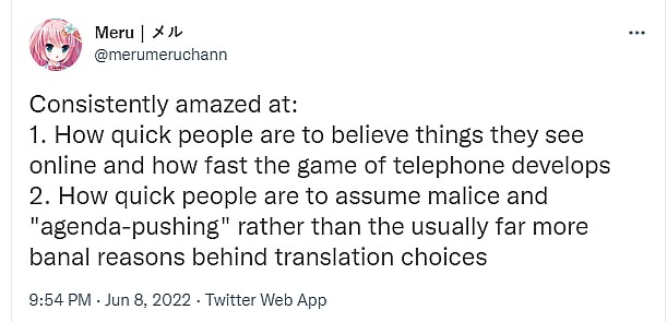 “Consistently amazed at: 1. How quick people are to believe things they see online and how fast the game of telephone develops 2. How quick people are to assume malice and “agenda-pushing” rather than the usually far more banal reasons behind translation choices,” began Meru.