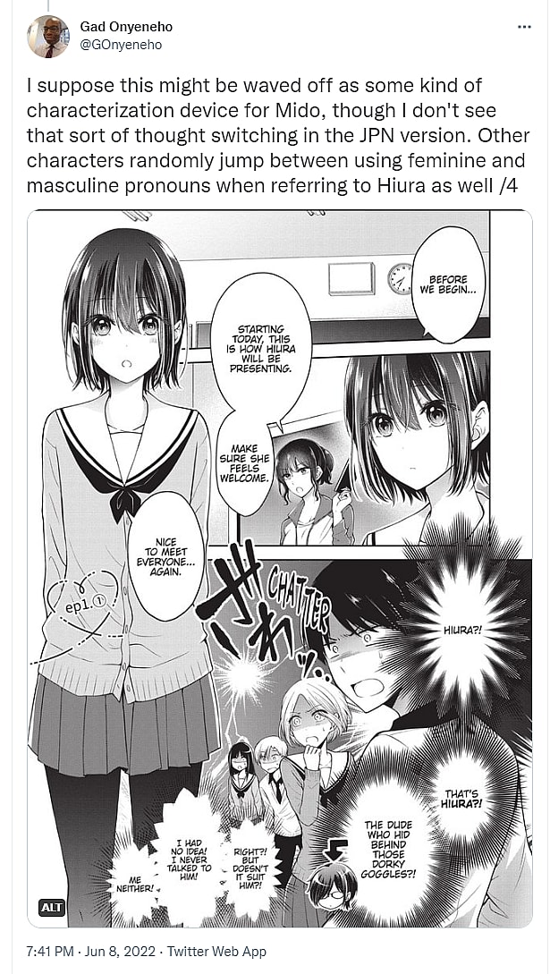 “I suppose this might be waved off as some kind of characterization device for Mido, though I don’t see that sort of thought switching in the JPN version,” Onyeneho said. “Other characters randomly jump between using feminine and masculine pronouns when referring to Hiura as well /4”