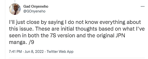 Making an initial attempt to draw his thread to an end, he then affirmed, “I’ll just close by saying I do not know everything about this issue. These are initial thoughts based on what I’ve seen in both the 7S version and the original JPN manga.”