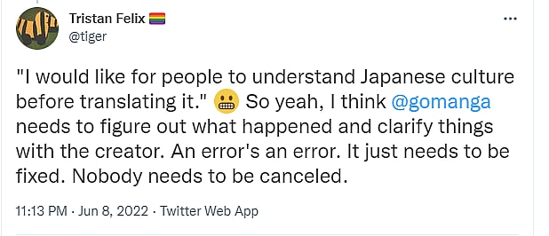 Sharing his friend’s wish that they “‘would like for people to understand Japanese culture before translating it,” Balistrieri asserted, “So yeah, I think @gomanga needs to figure out what happened and clarify things with the creator. An error’s an error. It just needs to be fixed. Nobody needs to be canceled.”