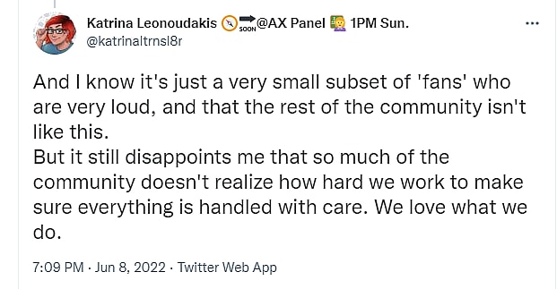 Leonoudakis “And I know it’s just a very small subset of ‘fans’ who are very loud, and that the rest of the community isn’t like this. But it still disappoints me that so much of the community doesn’t realize how hard we work to make sure everything is handled with care. We love what we do.”
