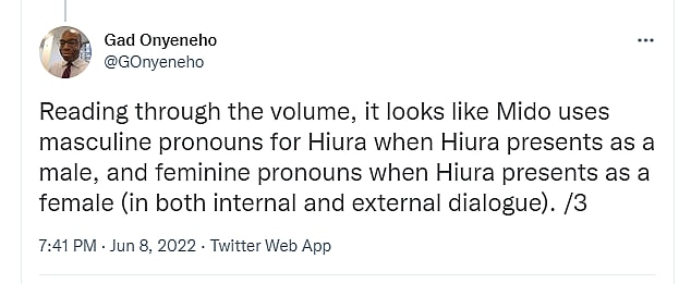He then noted, “Reading through the volume, it looks like Mido uses masculine pronouns for Hiura when Hiura presents as a male, and feminine pronouns when Hiura presents as a female (in both internal and external dialogue). /3”