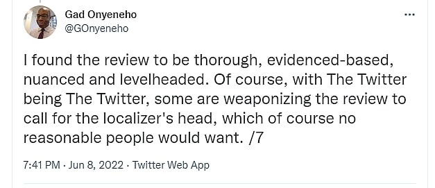 “I found the review to be thorough, evidenced-based, nuanced and levelheaded,” he praised Ethylene Scans’ work. “Of course, with The Twitter being The Twitter, some are weaponizing the review to call for the localizer’s head, which of course no reasonable people would want.”