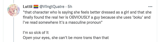 This tweet would draw a now-deleted response from Twitter user @ViingtQuarte, who attempted to argue against the claims that, as she summarized, the “‘character who is saying she feels better dressed as a girl and that she finally found the real her is OBVIOUSLY a guy because she uses ‘boku’ and i’ve read somewhere it’s a masculine pronoun'”.