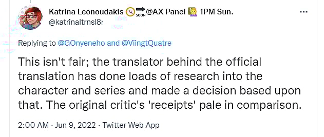 Making her own respective entrance, Leonoudakis would attempt to defend the mistranslation on the grounds that “the translator behind the official translation has done loads of research into the character and series and made a decision based upon that,” and in her opinion, “The original critic’s ‘receipts’ pale in comparison.”