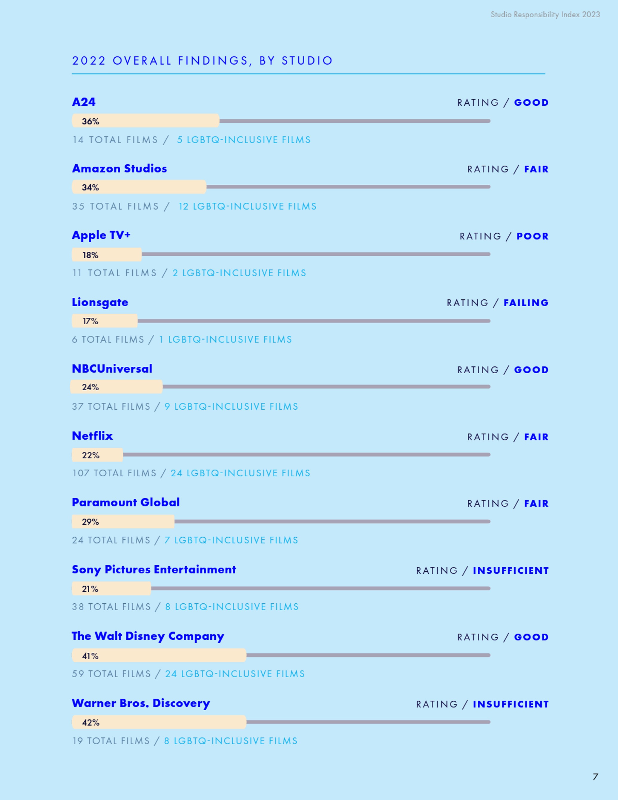 As part of this campaign, the last ten years have seen the organization produce an annual Studio Responsibility Index which grades and “maps the quantity, quality and diversity of lesbian, gay, bisexual, transgender, and queer (LGBTQ) characters in films released by ten major motion picture studios during the [given] calendar year”.