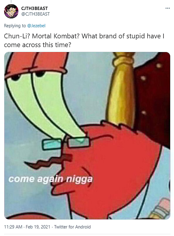 CJTH3BEAST wrote, “Chun-Li? Mortal Kombat? What brand of stupid have I come across this time?”