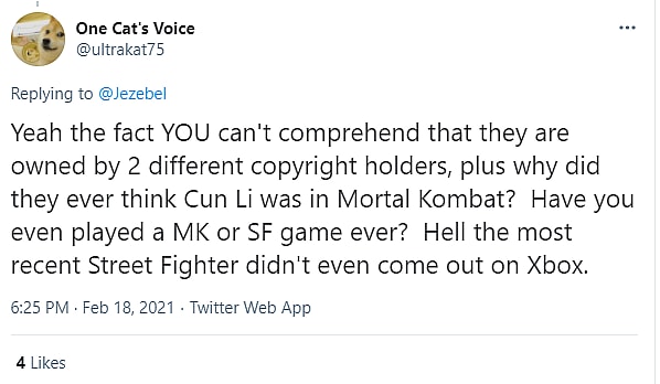 Ultrakat75 added, “Yea the fact YOU can’t comprehend that they are owned by 2 different copyright holders, plus why did they ever think Chun-Li was in Mortal Kombat? Have you even played a MK or SF game ever? Hell the most recent Street Fighter didn’t even come out on Xbox.”