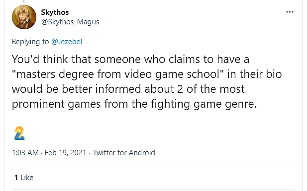 Skythos wrote, “You’d think that someone who claims to have a ‘masters degree from video game school’ in their bio would be better informed about 2 of the most prominent games from the fighting game genre.”
