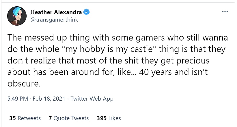 Alexandra wrote on Twitter, “The messed up thing with some gamers who still wanna do the whole “my hobby is my castle” thing is that they don’t realize that most of the shit they get precious about has been around for, like… 40 years and isn’t obscure.”