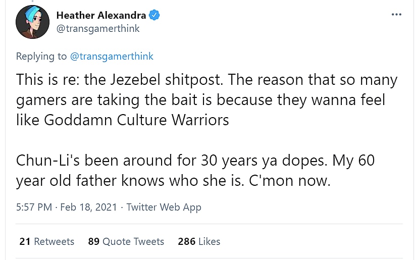 In a subsequent post, Alexandra specifically addressed the Jezebel article writing, “This is re: the Jezebel shitpost. The reason that so many gamers are taking the bait is because they wanna feel like Goddamn Culture Warriors Chun-Li’s been around for 30 years ya dopes. My 60 year old father knows who she is. C’mon now.”