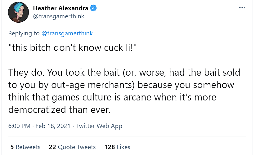 Alexandra concluded, “‘this bitch don’t know cuck li!’ They do. You took the bait (or, worse, had the bait sold to you by out-age merchants) because you somehow think that games culture is arcane when it’s more democratized than ever.”