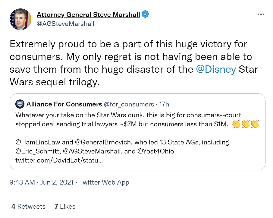 Attorney General Steve Marshall would get in on the action adding his own thoughts about how bad the Disney Star Wars films are.