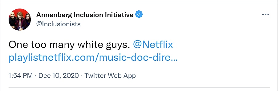As an example, in a tweet from December 2020 they responded to the Netflix Music Documentary Roundtable stating, “One too many white guys.”