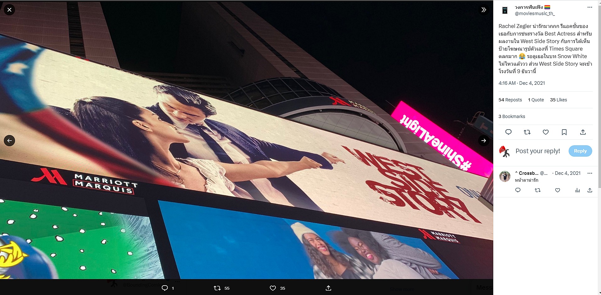 One Twitter user back in December 2021 shared an image of the West Side Story promotion on the New York Marriot Marquis, which is located in Times Square.