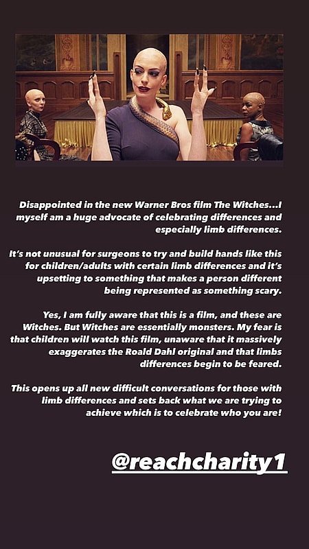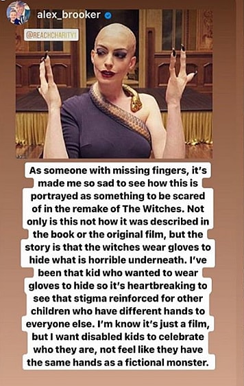 English journalist and comedian Alex Brooker, himself born with deformities in his hand, arm, and leg, wrote in an Instagram story that “as someone with missing fingers, it’s made me so sad to see how this is portrayed as something to be scared of in the remake of The Witches.”