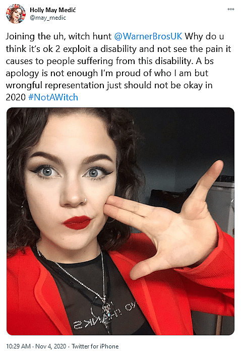 “Why do u think it’s ok 2 exploit a disability and not see the pain it causes to people suffering from this disability” @may_medic asked Warner Bros’ UK Twitter account. “A bs apology is not enough I’m proud of who I am but wrongful representation just should not be okay in 2020”