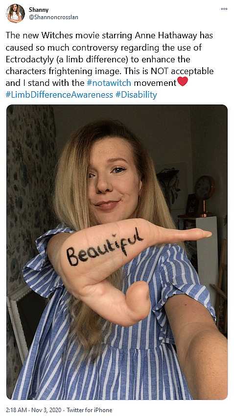 Twitter user @Shannoncrosslan declared that the appearance of Hathaway’s hands as a way “to enhance the characters frightening image” was “NOT acceptable.”
