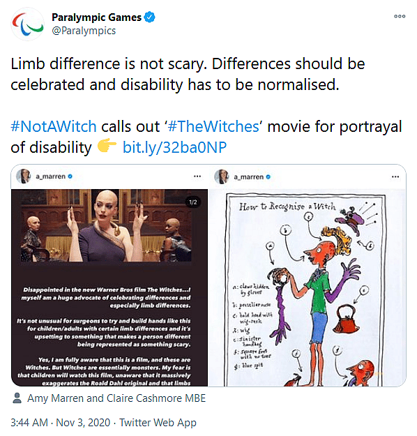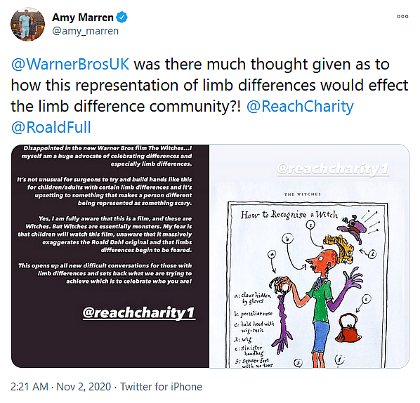 I am fully aware that this is a film, and there are Witches,” said Marren in a statement attached to the tweet. “But Witches are essentially monsters. My fear is that children will watch this film, unaware that it massively exaggerates the Roald Dahl original and that limb differences begin to be feared.”