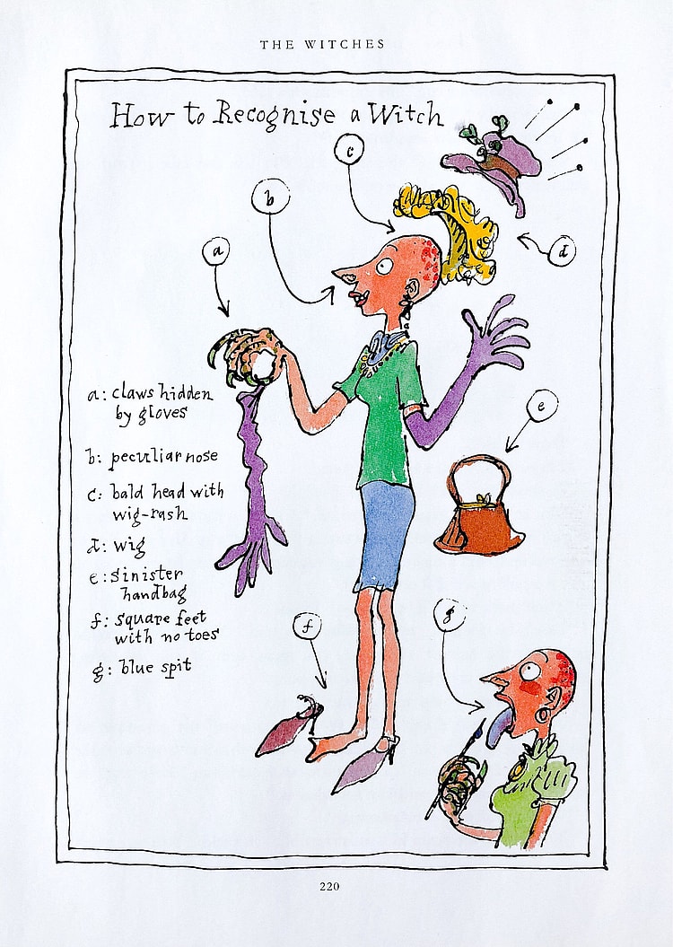 In an illustrated guide on “How to Recognise a Witch,” published in the original book, Dahl describes the various, horrific traits seen amongst witches, particularly noting that witches had “claws hidden by gloves.”