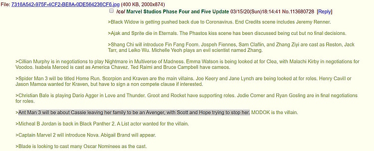 The rumor comes from 4Chan, on a post that provides updates on a ton of Marvel Studios films in development.