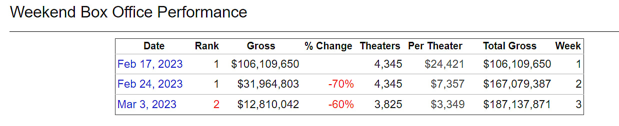 Ant-Man and the Wasp: Quantumania declined 60% in its third weekend from its second weekend. The film only grossed $12.8 million domestically. It has only grossed $188 million total domestically and $232.6 million internationally for a global gross of $420.7 million.