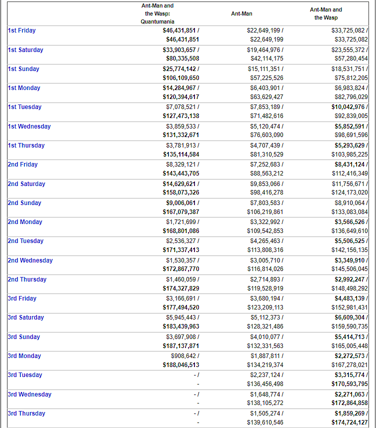 Comparing the film to the previous two films in the franchise, OMB Reviews says, “We are now starting to see not only the numbers going well below that of the second Ant-Man and of the first Ant-Man film when compared in its first week, in its first run.”